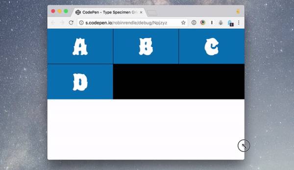 看见效果了就开心了吧,哈哈。但是看到两列之间的黑线了吗?这是 wrapper 勾勒的每个字母 div 的背景,因为我们将 grid-column-gap 设置为了 1px。通常,我们会设置更大的距离,尤其是对于两个相邻的文本框来说。但在本例中,1px 就足够了。