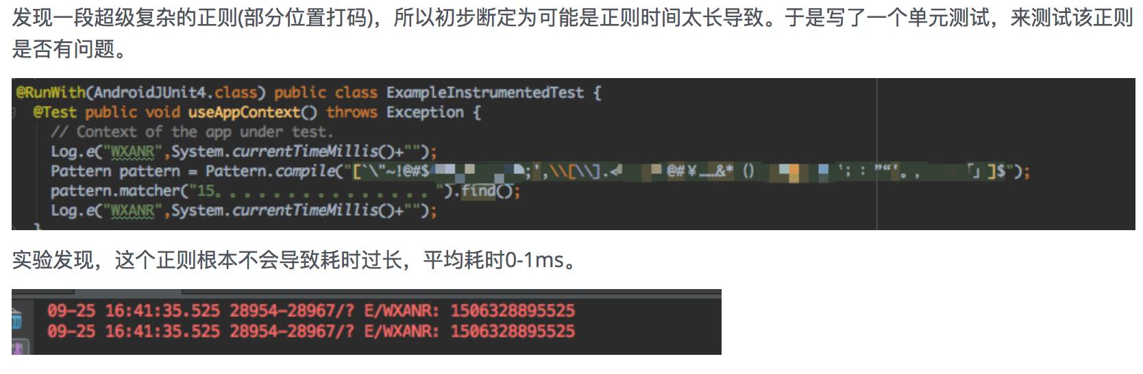 国庆前几天,微信Android大量用户反馈接收或发送类似“15。。。。。。。。。。。。。。。”信息会导致微信聊天界面卡死,程序崩溃。这对微信来说是很严重的事情啊,一时半会反馈也铺天盖地的过来,我们得知这个问题后,第一时间对这个问题进行了紧急修复并在两天内覆盖了全网大部分用户,最终这个问题得到了解决。追根溯源,毫无疑问这锅开发小弟来背,这次不能冤枉了产品MM哈哈。