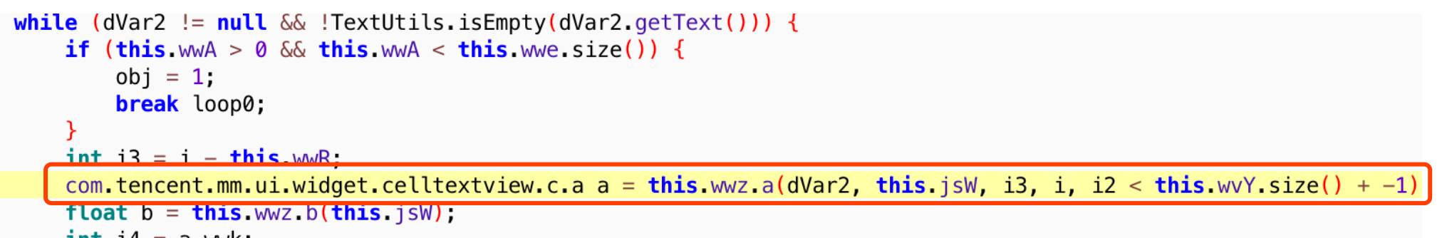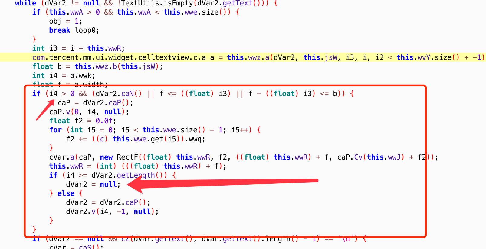 “i4”变量实际是断句算法返回截断的实际位置,dvar2.getLength()实际是当前行的文字长度,这里因为断句算法的bug,造成了”i4”这个变量一直返回0,而当前行文字长度dvar2.getLength()是>0的,所以这个dVar2永远不会被赋值为空。继续追根问底:是什么原因造成断句算法一直返回0呢,实际上断句算法是调用了以下这个函数: