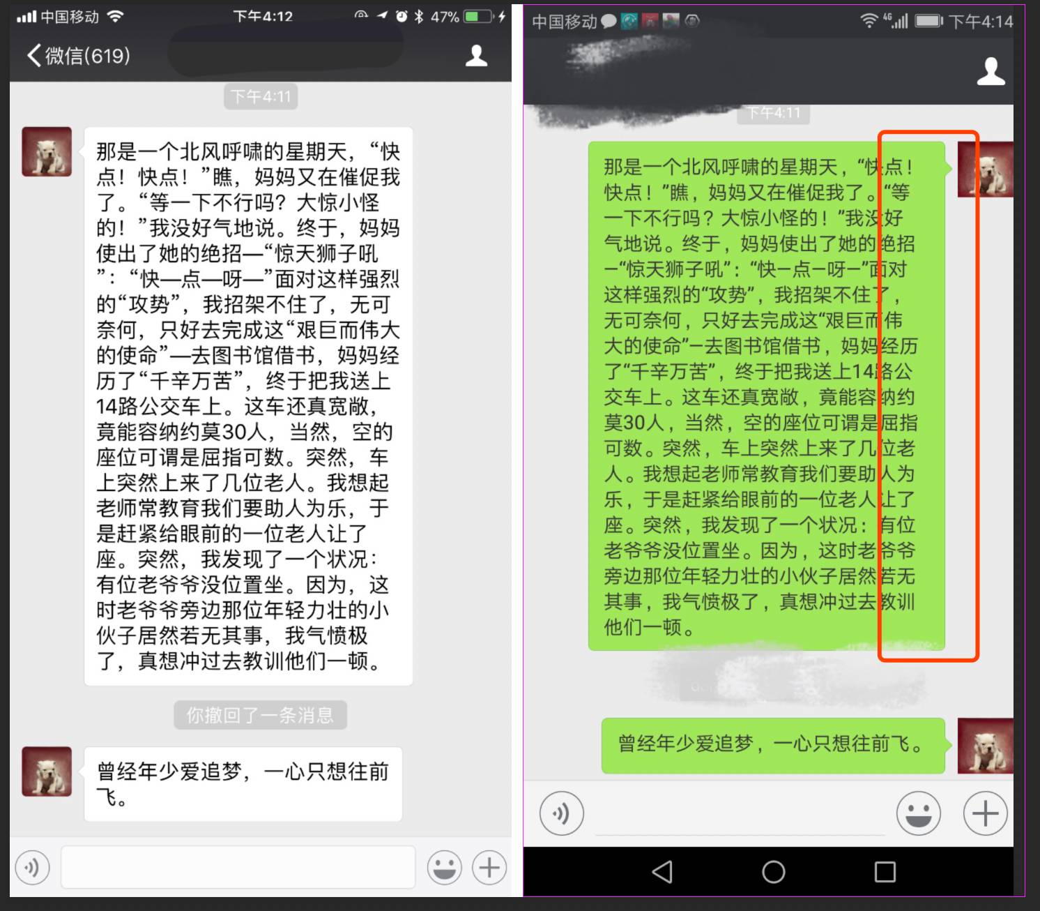那么,iOS的排版是否就是完美的呢,其实仔细观察并非这样,从上图可以看出,除了Android,iOS也会有这种问题,那就是气泡中的文字左右参差不齐。