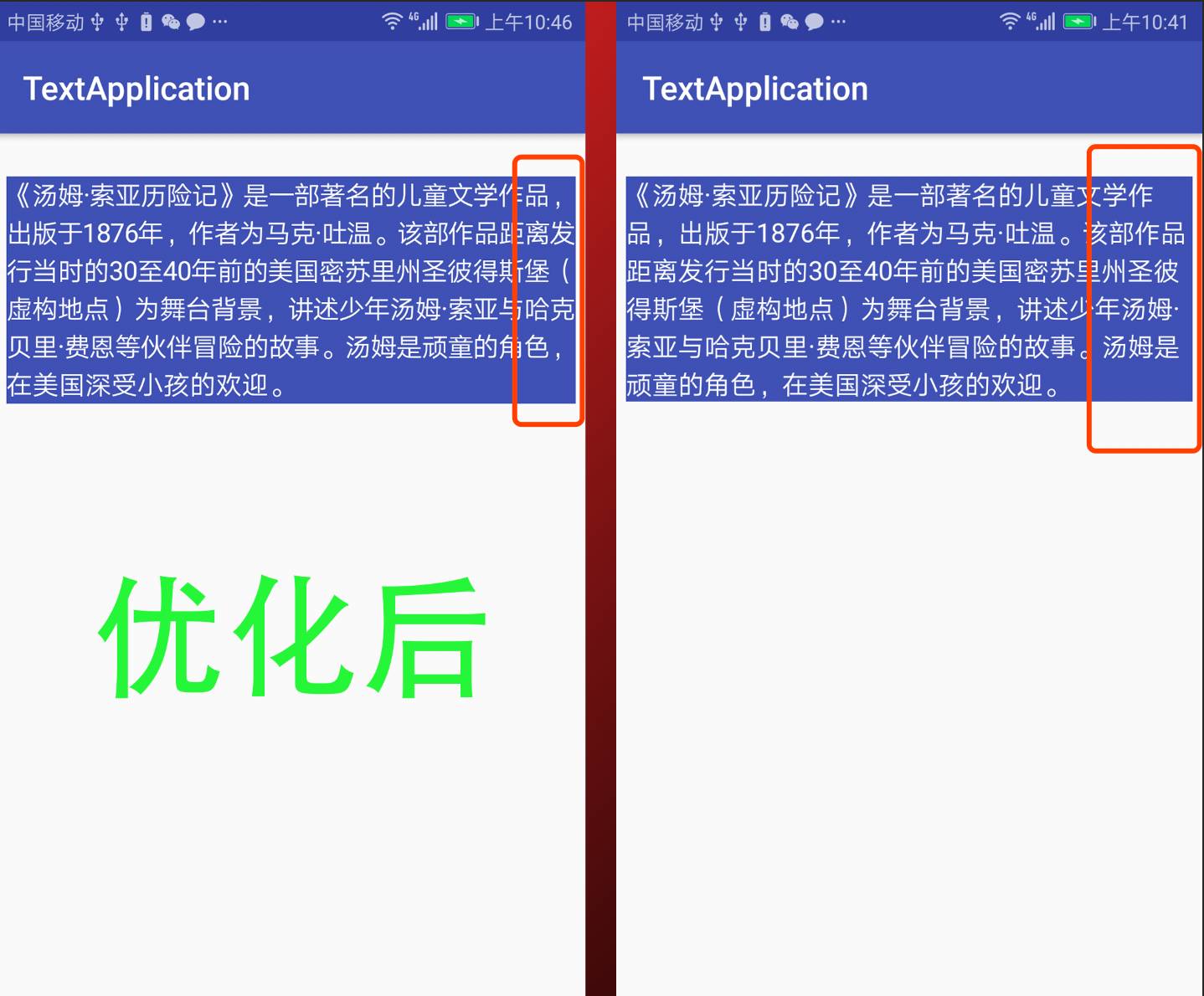 | setText(ns) | 1345208 | 8839618 | 相同1000char的文字,连续每隔100ms,setText一次,统计30次平均耗时 |