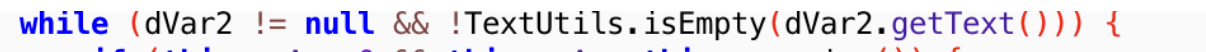 因为dVar2且dVar2.getText一直不为空,一直满足这个条件,所以造成死循环。而dVar2这个值为null的条件取决于下面这个函数