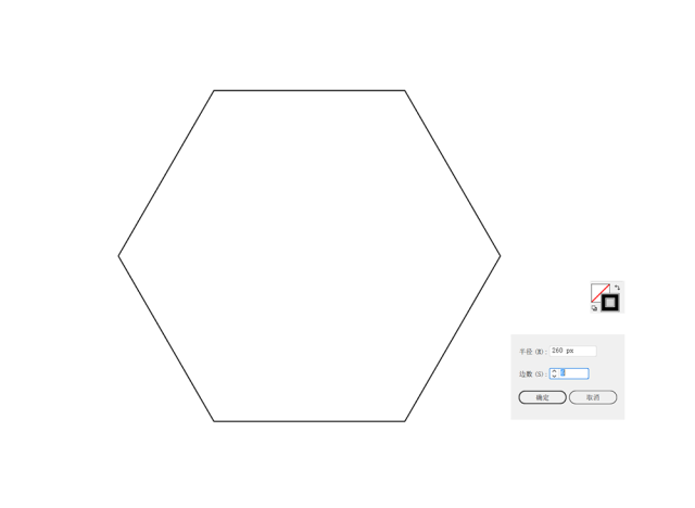 造型开始,打开AI,新建一个800*600px的文档。选中多边形工具,在画布上双击,并在弹出的对话框中的“边数”一栏中填入6,这里所填入的边数也可以是其他的值,当然最后的造型就肯定和这个教程不太一样了。熟悉AI工具的同学可以试试别的边数。填充色关闭,打开描边,描边粗细为1px。
