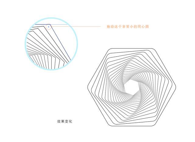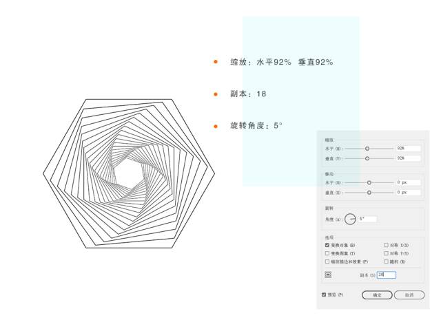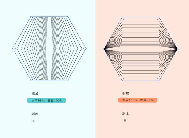 这里的缩放比例和副本是一对必须共存的参数,如果没有比例的缩放,那么副本填多少都没有意义,因为多出来的所谓副本(也即是复制的形状)是重叠于原有形状上方,由于变换的效果并没有产生真正的路径,因此其形状外观上并没有发生变化。而增加了缩放的产数就不一样了,你会看出这些副本在缩放情况下的变化,这种变化是渐变分布的,因此产生出视觉的韵律。理解了这一道理,我们再调节产数时就不会盲目。
