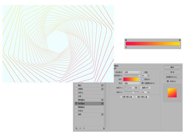 然后为线条增加渐变叠加的图层样式,渐变色彩从明快的红色到黄色。