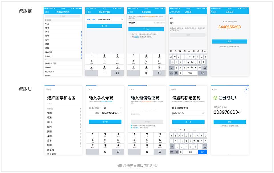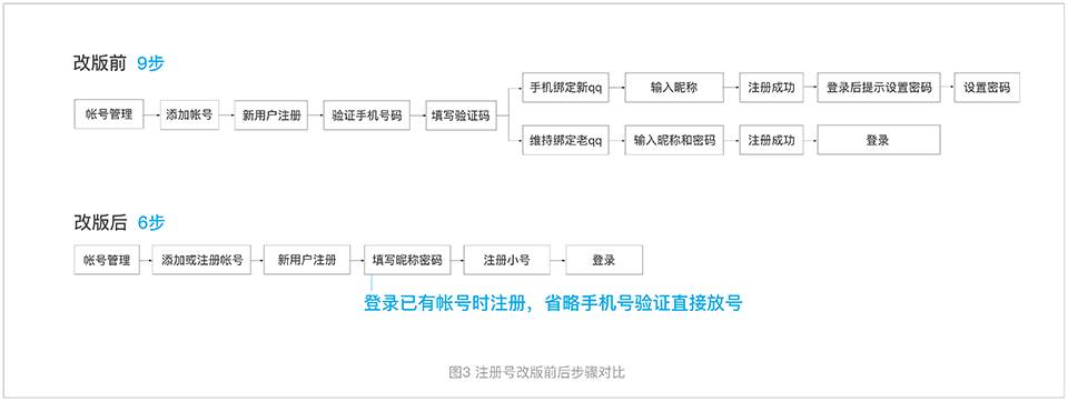 设计前,观察数据中获知手机QQ里有18.87%的用户进入注册流程后,无法完成整个流程。为了解决这个问题,我们通过缩短用户注册步骤,来让用户更容易的获取QQ号,从而避免用户在注册QQ号中受挫。所以从改版前后的对比中可以看到我们在注册小号时直接放号,不要手机验证,缩短步骤(从9步到6步)。