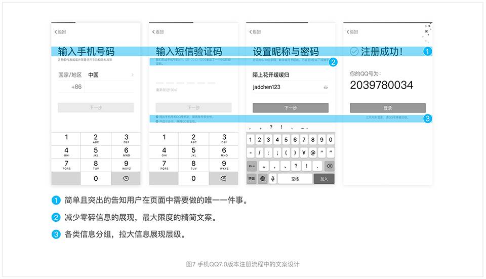 手机QQ在7.0版本的注册Redesign中,首先分析页面信息优先级,将页面信息按权重排序,依次为核心步骤层、内容输入层、辅助信息层,还有包含可点击交互操作的操作引导层。然后通过字号、字色与字重拉开信息层级间的差距,最终将用户聚焦到核心信息上来。
