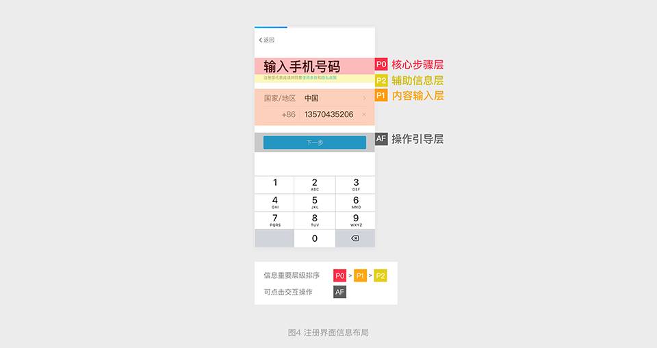 a、核心步骤层,是指用户在短暂时间内浏览页面时,能让其一目了然的获知当下应该操作的某个步骤。例如“输入手机号码”是这个页面的重点核心内容,其设计需要重点突出,且精炼文字。