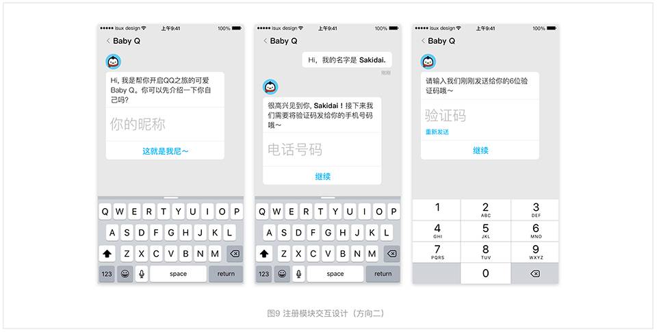 注册是一个复杂乏味的交互操作程序,除了一味的下一步再下一步,我们也在思考一些有更多创新点的交互形式。例如我们作为一款社交产品,可借助自身message的形式,让整个注册流程像与人交流一样自然顺畅且轻松。这里我们尝试通过与Baby Q对话来注册,让用户时刻明白自己所处的流程步骤,熟知上下文。同时也会让注册产生更多趣味性,并且愿意与Baby Q产生信赖感,提交更多的个人信息。
