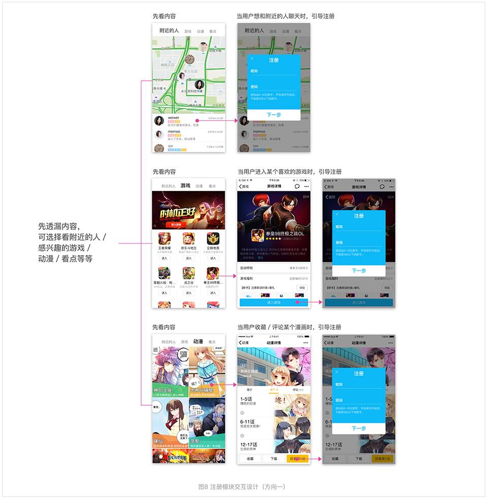 先看内容(附近的人、游戏、动漫、看点等),当用户对内容想要互动和操作时(想和附近的人聊天时,想进入某个游戏时,想收藏和评论某个漫画时),再提示用户注册账号。贴心的产品应该让用户看到让他感兴趣的内容后,当用户想有有进一步操作时才提示用户注册帐号。先勾起用户的欲望,再让用户注册进来,让用户感知到这个注册账号的价值。例如各类购物类APP,先让用户看商品,到确认购买支付之时才需注册。