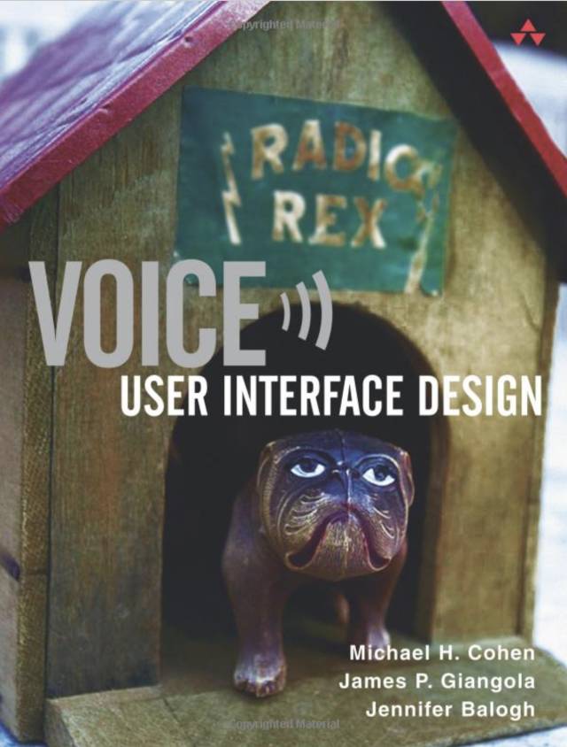 《Voice User Interface Design》,作者 Michael Cohen,James Giangola, Jennifer Balogh。这是2004出版的书,相对比较老旧,针对是早期的IVR(Interactive Voice System,交互式语音系统),不过里面的一些设计原则在今天依旧适用。