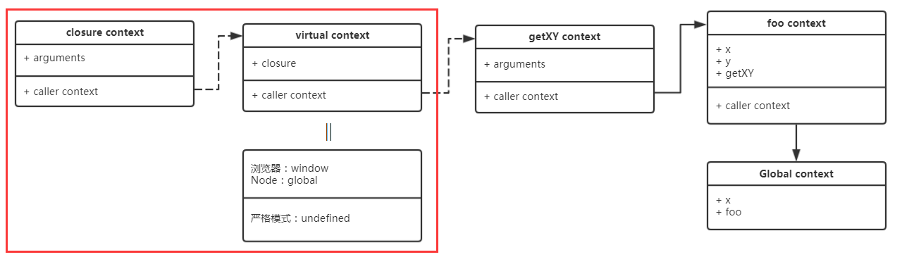 那这个虚拟上下文是什么呢?在非严格模式下是全局上下文,浏览器里是 window ,NodeJs里是 Global ;在严格模式下是 undefined 。