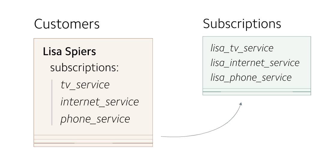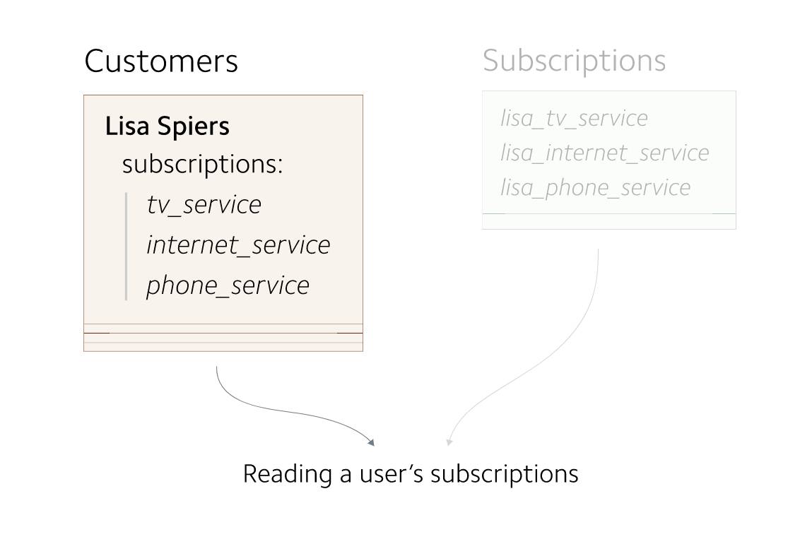 在早期,每个 Customer 对象最多只有一个 subscription 。 customers 信息存储为单独的记录。因为 customers 到 subscriptions 之间的映射关系非常简单,所以subscriptions 信息与 customers 信息存储在一起。