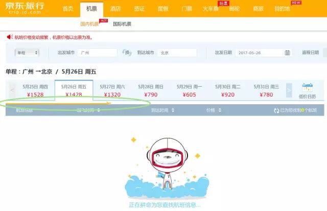 京东旅行在搜索航班信息时,有一个橙色飞机进度条。当飞机从界面左端逐渐向右端滑行时,从最开始未找到航班信息的动效开始,逐渐到「已为您找到 x 个航班」,待航班数量不断增加并最终完成搜索后,该进度条才消失。
