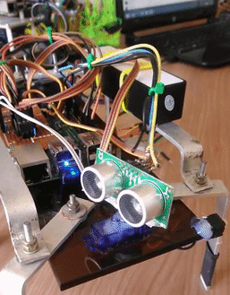 头部由超声波传感器和连接到电路板的微型伺服电机组成。我用热胶将微型伺服与传感器连接起来: