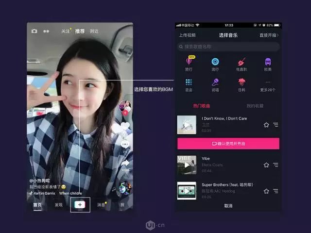 接下来就该介绍一下抖音的核心功能了,如何拍摄一个完整的视频。我们点击中间的[加号]按钮(如下图),进入到选择音乐页面,在这个页面里我们可以选择与你所拍视频风格相对应的背景音乐,Tips如果你是IOS11的用户,抖音现在还支持AR相机哦,如果你想体验AR功能,记得升级IOS11哦!