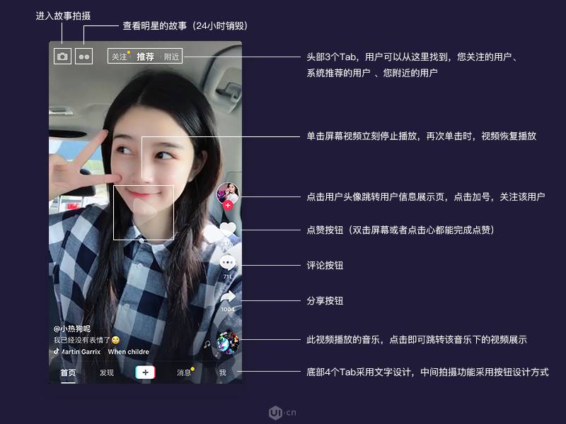 头部主要由3个Tab组成,分别是关注,推荐,附近,通过字面意思不难理解这3个页面所要展示的内容,关注和附近我就不过多解释,稍微要做下解释的就是推荐,所谓推荐,就是抖音平台通过算法向您推荐该阶段比较火的视频,当阶段最新的视频,当阶段离你最近的用户所拍摄的视频。