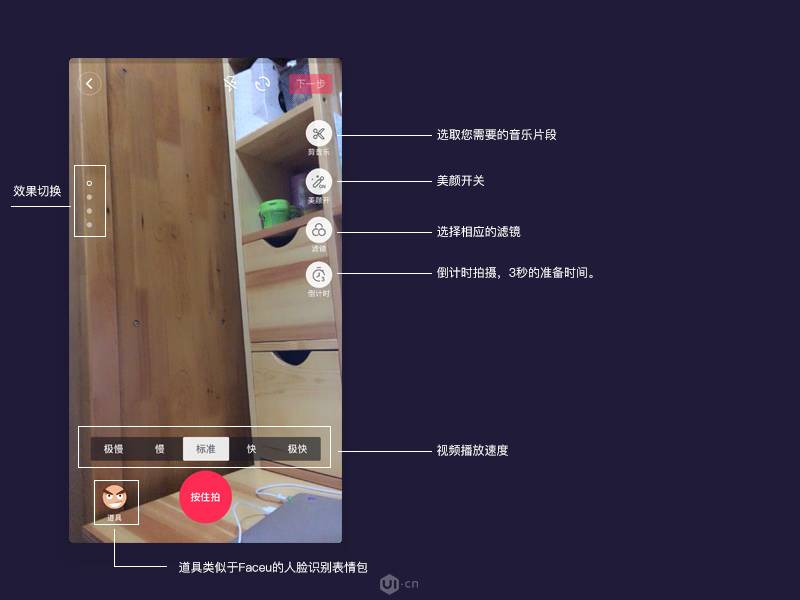 当我们选择好背景音乐后,我们点击开拍的红色按钮,即可进入到我们的拍摄界面,和其他的视频拍摄界面一样,抖音的拍摄界面也是简单易懂,核心功能就是视频的拍摄与剪辑。