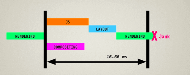 所以,如果网页动画能够做到每秒60帧,就会跟显示器同步刷新,达到最佳的视觉效果。这意味着,一秒之内进行60次重新渲染,每次重新渲染的时间不能超过16.66毫秒。
