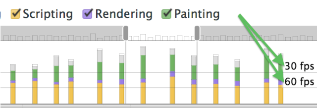下面的一条是60FPS,低于这条线,可以达到每秒60帧;上面的一条是30FPS,低于这条线,可以达到每秒30次渲染。如果色柱都超过30FPS,这个网页就有性能问题了。