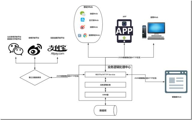 目前国内的互联网创业,以Web为主,完整的技术产出可能包括 App、微信公众号、支付宝服务窗、微博应用、移动Web(兼容移动浏览器、微信浏览器、支付宝浏览器、微博浏览器)、官网Web、管理Web,在这样的产品产出要求,我认为如下的架构比较合适