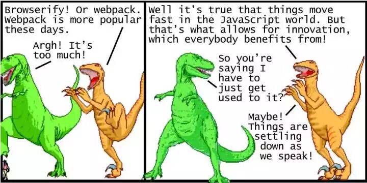 现代 JavaScript 有时可能真的会让人觉得很沮丧,因为飞速的变化和发展。尽管有时候看起来像是在重复造轮子,JavaScript 的快速进化却推动着创新,比如热更新,实时 linting,时光旅行般的调试。作为一个开发者这简直让人兴奋。希望这些信息,在你的旅途中能够有意义~