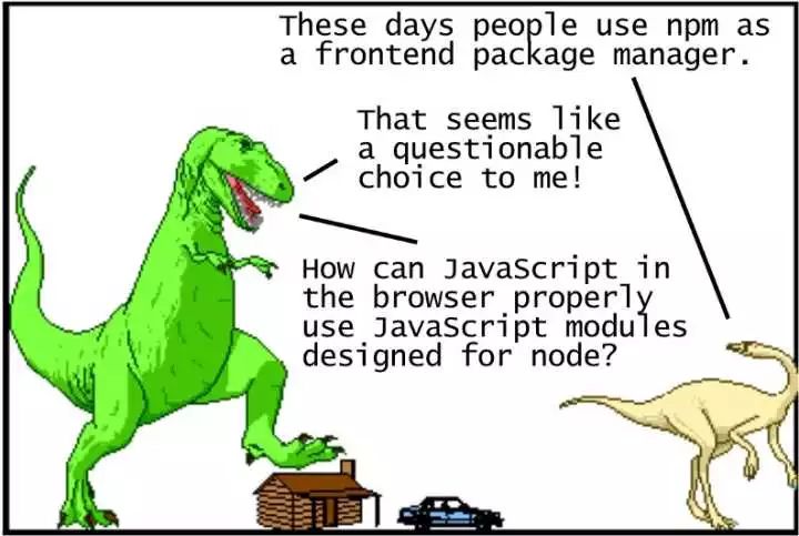注意到,npm 作为一个包管理工具,最开始是专门为 node.js — 一个运行在服务器端的 JavaScript 运行时 (runtime) 而准备的,并不是前端。所以选择它作为在浏览器中运行 JavaScript 的前端包管理工具似乎有些奇怪。