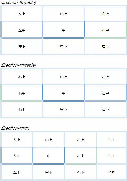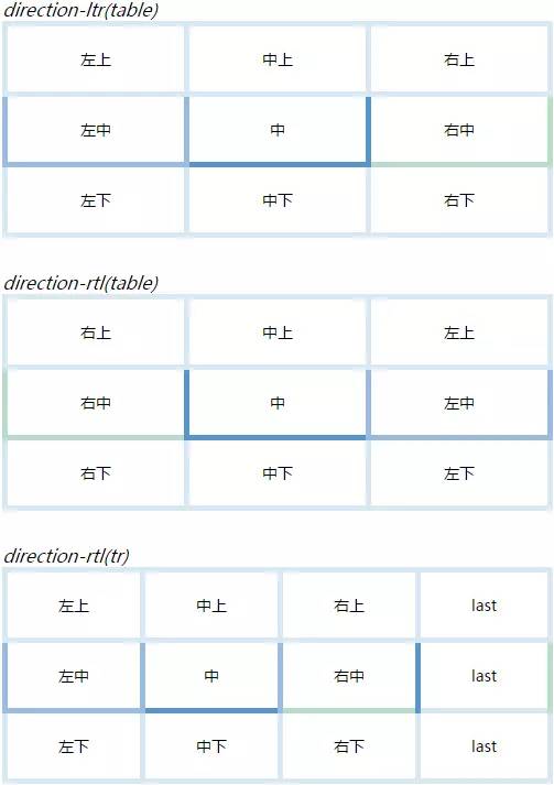 • table上使用direction: rtl;属性,会使单元格左右调换,并且发生冲突的单元格相对较右侧单元格的样式