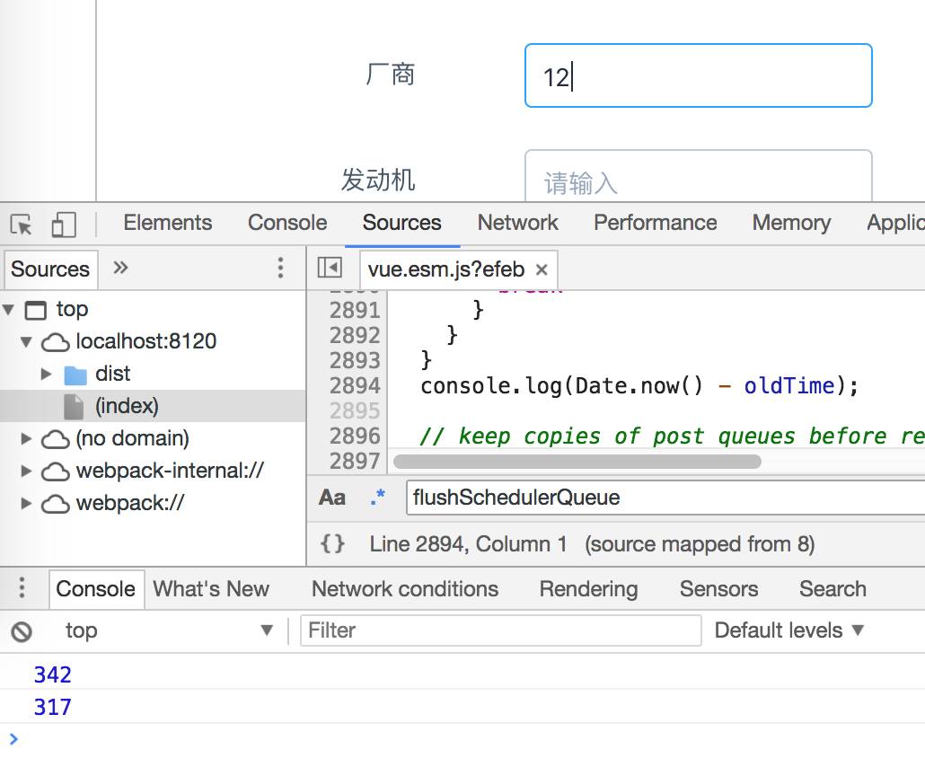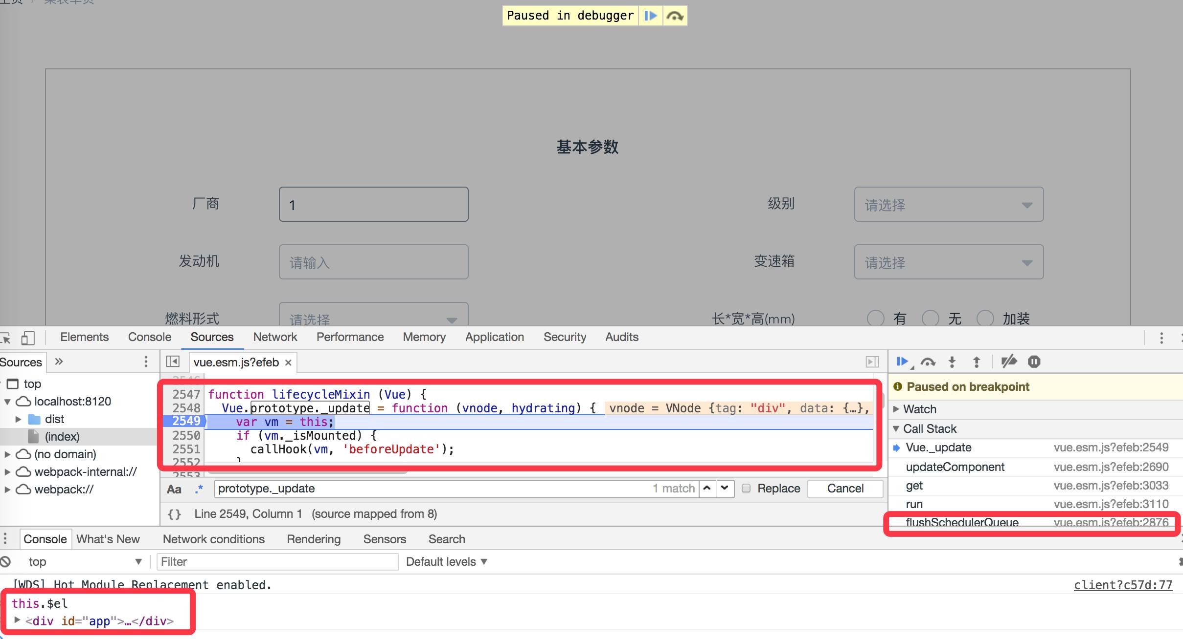 只是用一个 edit-form 包裹刚刚所有的 el-form-item 的渲染代码就解决了,再次调试 Vue.prototype._update 得出遍历节点 this.$el 已经变为下图所示的 div.edit-form 了,flushSchedulerQueue 函数 for 循环的延迟也变为 10ms 左右