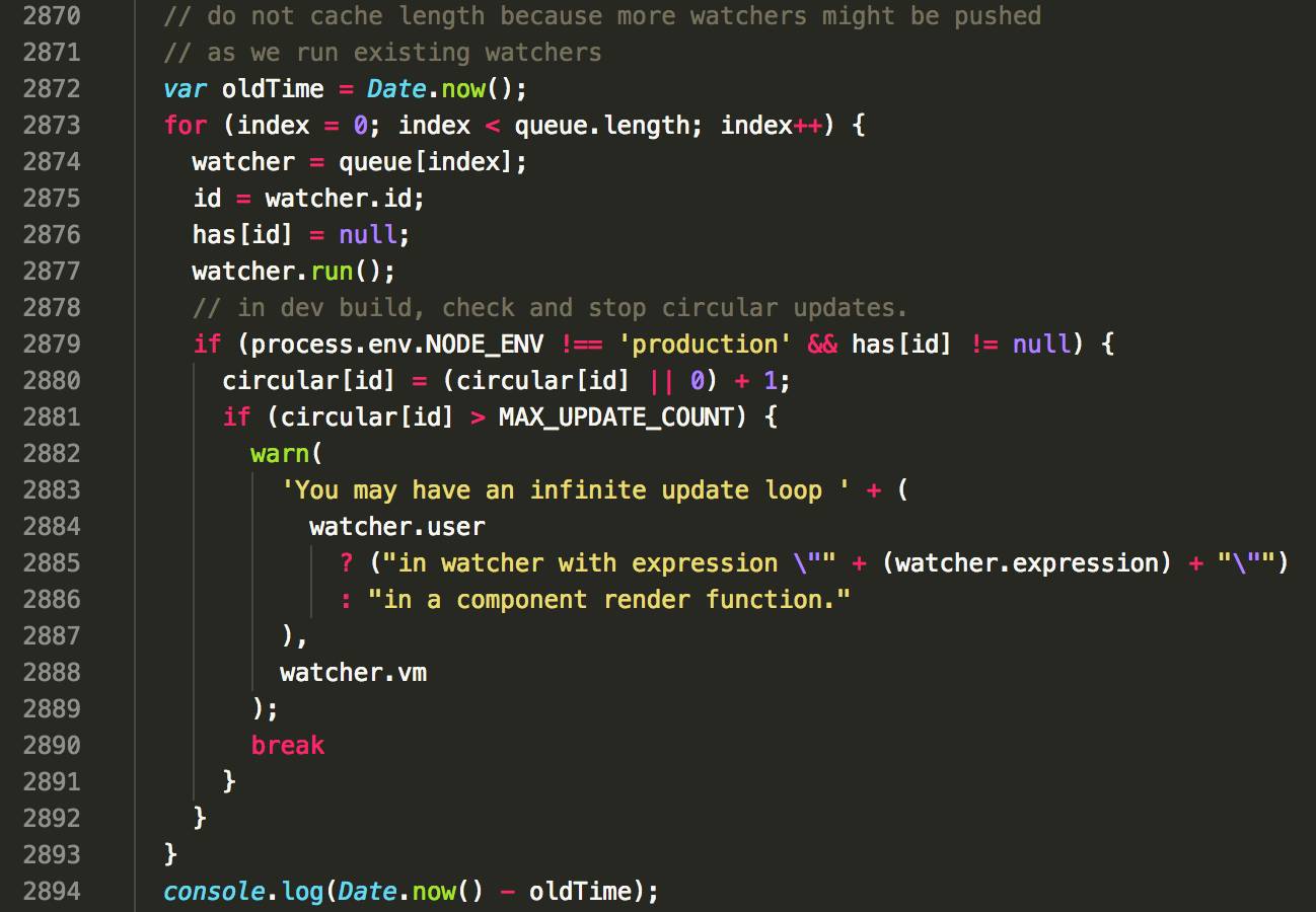 似乎问题就找到了,flushSchedulerQueue 函数针对 data 中数据的修改把 watcher 推送进队列里在更新,这一循环耗费的时间比较长。