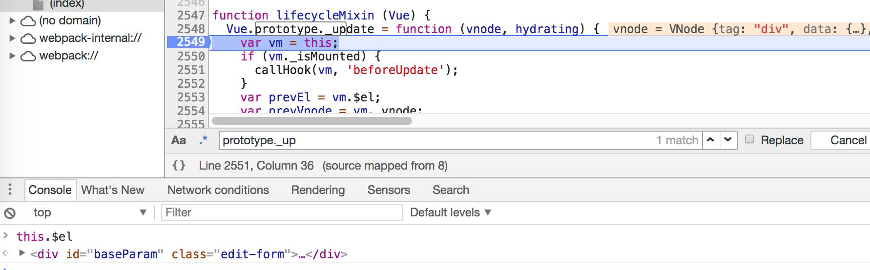 Vue.prototype._update 这函数里触发的是 VNode 虚拟节点的比对更新,打断点调试后发现实际上这是一个循环,在控制台里输出 this.$el 的时候能得到正在深度遍历中的节点,沿着根结点 App(也是 formConfig 数据绑定的作用域) 开始直到具体触发输入的那个表单元素。