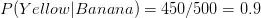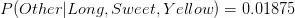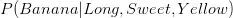 第一步:想要计算水果是香蕉的概率,我们首先发现这个式子看起来很熟悉。这就是在属性为长形、甜和黄色的条件下,水果是香蕉类的概率,这个表达更简洁一些: