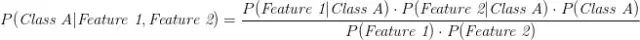 ▪ 分数的分子是在分类 A条件下属性1的概率,乘以在分类 A 条件下属性2的概率,再乘以分类 A 的概率