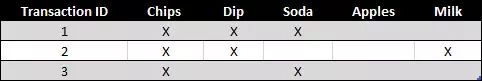 举个 Apriori 算法的例子:我们假设有一个充满超市交易数据的数据库,你可以把数据库想象成一个巨大的电子数据表,表里每一行是一个顾客的交易情况,每一列代表不用的货物项。