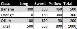 如果我们根据长度、甜度和水果颜色,在不知道它们类别的情况下,我们现在可以计算水果是香蕉、橘子或者其他水果的概率了。