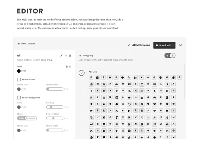 从 Maki Icons Editor 可以编辑包括颜色、背景颜色、中空效果、深色背景或加入圆角及方形外框等等,编辑后可实时预览,勾选你需要的图标然后点击右上角的「Download」打包下载。当然在在线编辑器可修改的范围较小,效果也不一定令所有人满意,有兴趣的朋友可以试试看。