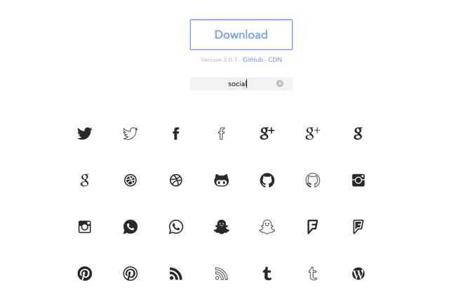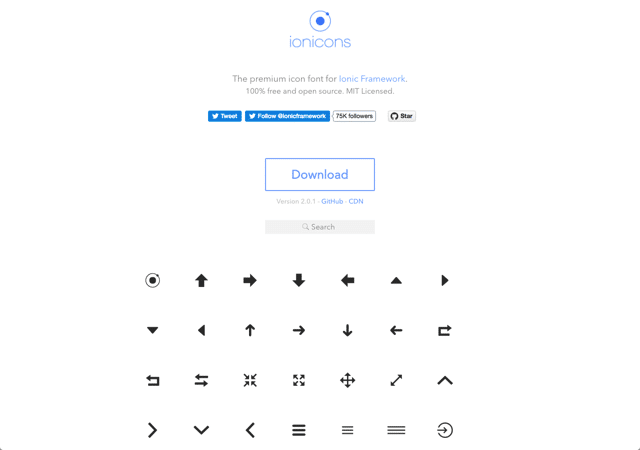 Ionicons 目前已经有超过 700 种图标图案,除了使用者界面开发会用到的按钮图标外,它也收录几个常见的社群网站图标,例如:Facebook、Twitter 和 Google+ ,对于想加入社群按钮来说就很方便,不用再额外载入其他图标拖慢网页开启速度。
