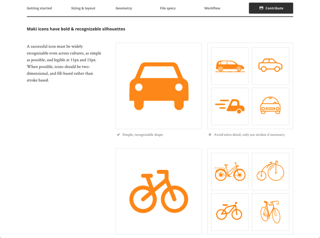 为了让阅读者可以一目了然,这些图标并没有太多复杂的细节设计,即使没有细看也能有极高的辨识度,Maki Icons 为了让使用者能正确编辑、修改这些图标,还准备完整的设计指南(Design Guidelines),教你如何在编修图标后又不影响到原有的简洁和易读性。