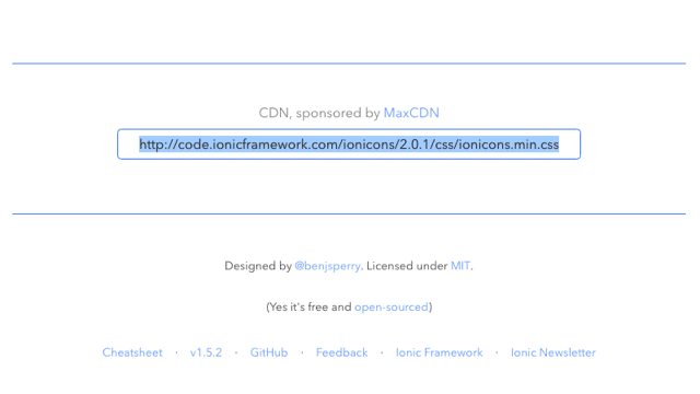 点击网站上方的「CDN」或直接拖曳到 Ionicons 网页最下方,可以找到 MaxCDN 赞助的链结,这个链结也支援 SSL。如果你觉得这个托管服务不够快,也可以直接从 GitHub 将完整档案下载下来上传到自己的主机空间使用,两种方法基本上是相同的。