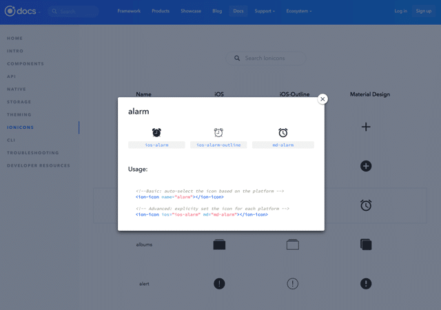 要如何在网页里调用某个图标呢?这部份可以参考 Ionicons 说明文件,里头会有一些基本使用范例。