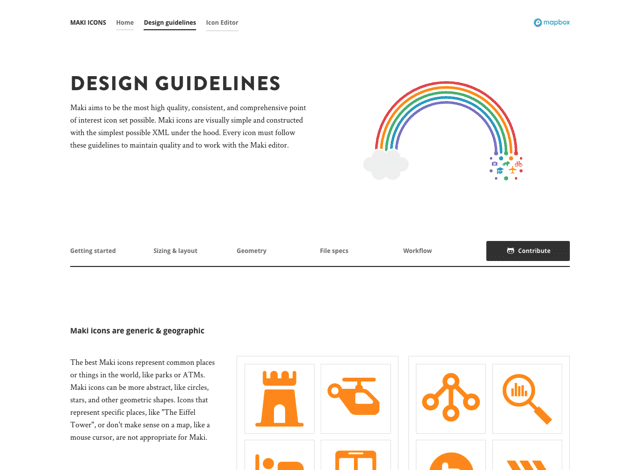 我认为 Maki Icons 最有价值的部份除了三百个图标,最重要的是「设计指南」相当用心,如果你想要修改图案设计,务必要仔细阅读这个页面,它有非常详细的 Maki 图标风格设计准则。