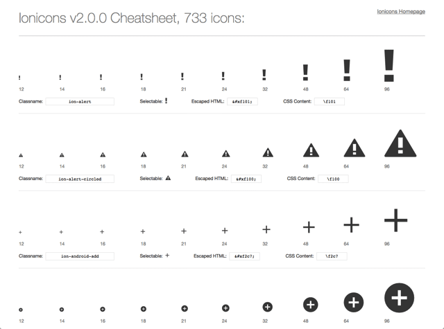 最后,我再推荐一下 Ionicons 提供的「Cheatsheet」也就是小抄页面,非常好用!这个页面里会有每个图标在不同大小的显示样式预览,以及样式名称(Classname)、HTML 和 CSS Content,对于开发者来说应该会用到。