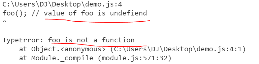 正如你在上面的图片中看到的那样,foo在执行上下文的顶部被声明为一个变量,然而,在变量foo中的函数赋值发生在第6行,也就是创建作为表达式函数的地方。所以,当你尝试执行上面的代码时,你会得到错误undefined is not a function,如下图所示: