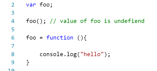 你正在代码中创建函数foo作为表达式,所以JavaScript会像普通变量一样提升它。 JavaScript会像下图所示那样处理上面的代码: