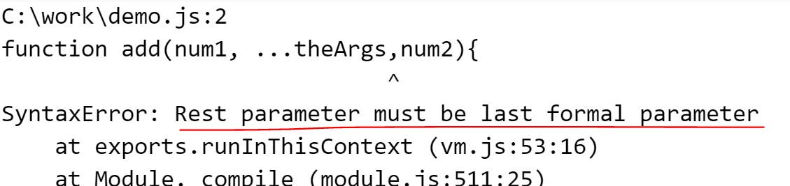 在上面的代码中,rest参数不是最后一个参数,所以JavaScript会抛出错误。rest参数必须是最后一个正式参数。