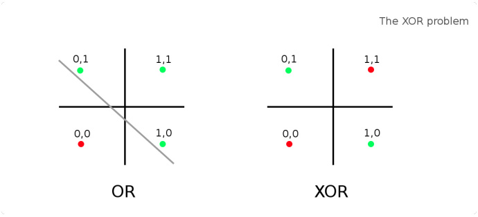 经过最初的炒作一年之后,Marvin Minsky 和 Seymour Papert 击碎了这个想法(1969, Minsky & Papert)。当时,Minsky 和 Papert 都在麻省理工学院的 AI 实验室工作。他们写了一本书,证明感知机只能解决线性问题。他们还批判了关于多层感知机的想法。可悲的是,Frank Rosenblatt 两年后因船难去世。