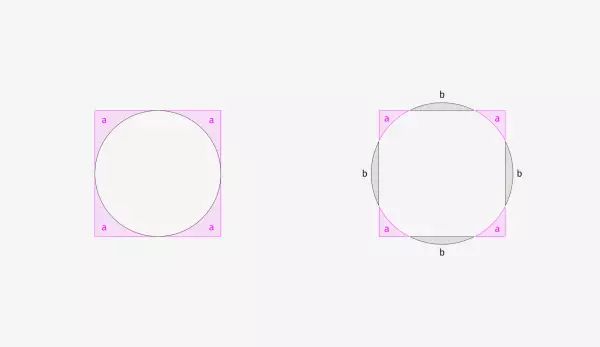 现在我们将图形都叠起来看,看看为什么会产生这种那么明显的误差。400px 的两个图形叠在一起,你会发现整个圆形都被包裹在了正方形之内,而正方形多出的四个面积巨大的 a 区域就是造成这种视觉误差的原因。再将 400px 的正方形与 450px 的圆形叠在一起,正方形无法将整个圆形包裹在内了,圆形超出的四个 b 区域又与 正方形多出来的 a 区域在视觉上互相抵消,所以 450px 的圆形与 400px 的正方形在视觉尺寸上更接近,也就是我们常说的“一样大”。