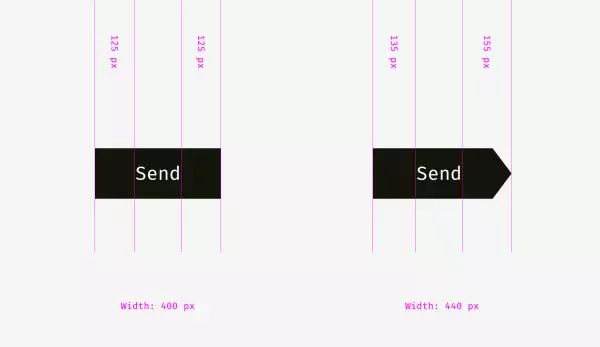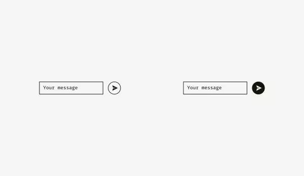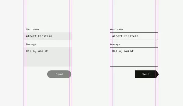 左边的浅色背景输入框框体不会与标签文字对齐,框内文本才会与标签对齐。右侧的深色边框的输入框的框体就要与标签文字对齐,而框内容无需与标签文字对齐。再看看发送按钮,左边的发送按钮与浅色背景的输入框为了达成视觉对齐故意地做短了一点点,右边的发送按钮也因为形状的缘故被故意地做长了一点,达成视觉对齐。