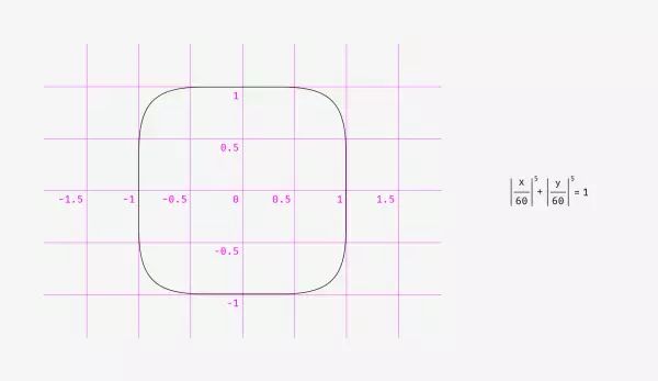 这种曲线的方程式如下,从 iOS7 起,iPhone 所有的 icon 都基于此进行设计。除了那些 blingbling 的细节以外,除了这一种说法之外,还有说是由连个堆成的羊角曲线拼出来的。iOS 还有很多这些内涵深厚的细节,不得不感叹用户界面设计真是一门精深的学问。