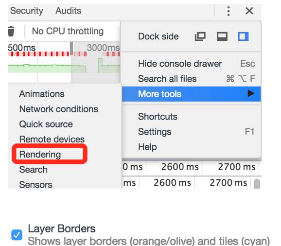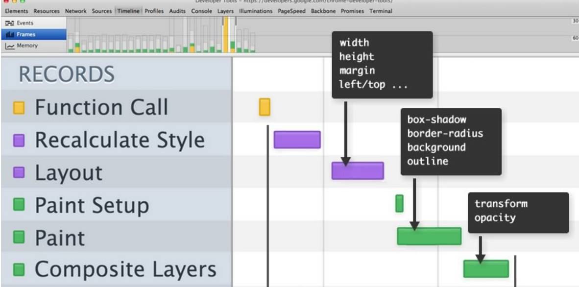 需要注意的是,不要创建过多的渲染层,这意味着新的内存分配和更复杂的层管理。不要滥用GPU加速,注意看 composite layouts 是否超出了 16ms